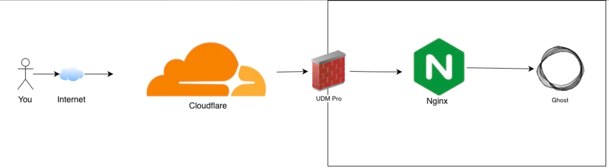 In short, you hit cloudflare, go through my firewall, then hit my reverse proxy that is in front of all my internet facing containers (only Ghost shown). The firewall only allows cloudflare IPs on :443, nothing else, and secondarily nginx also only trusts cloudflare IP addresses and will deny anything else (defense in depth anyone?). The containers run on Unraid which among other things, runs Docker.